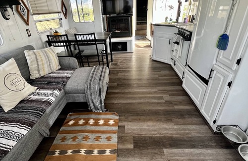 The Lookout is on 1.25 acres of southern AZ land atop the highest hill in the J-6 Ranchettes. Primarily you will be staying inside our remodeled one-bedroom Jayco Designer 32' Trailer which has a shower, toilet, a furnished kitchen, Wi-Fi, two flat screen TVs (each with a Roku), hot water, a water cooler, a DVD player (with a small collection), and a refrigerator/freezer. However, if all of that sounds too fancy you are also welcome to bring a tent and sleep under the stars!