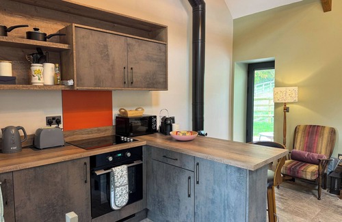 Ty Ni has an open plan living, dining, kitchen and bedroom area, with high exposed beams and a modern log burner to make you feel extra cosy! Logs are supplied during your stay.