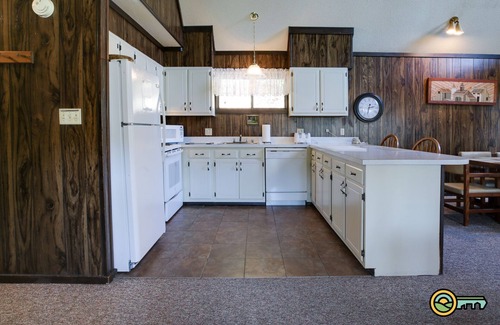 The open, spacious great room includes a dining room and living room with a wood-burning fireplace. Firewood is provided from late fall through early spring. The kitchen is conveniently located adjacent to the great room and includes basic cookware, tableware, appliances, and a basket-style drip coffee maker (filters provided, but please bring your favorite grind). The main floor also includes a bedroom with king bed, a second bedroom with double bed, and full bath with Jacuzzi tub and laundry. The cozy loft has two twin beds, a double bed, and half bath. Sleeps 8.