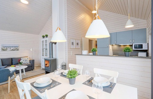 The modern wooden house Waldfrieden impresses with its Scandinavian style and offers enough space for 4 adults and 2 children. Thanks to the ridge-high open ceiling, you can enjoy a pleasant feeling of space and light-flooded rooms. The maritime furnishings in light colours contribute to the cosy atmosphere.