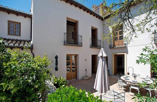 The unassuming facade of the house reminds us of the rich Arab history of Spain, when wealth was hidden behind the facades of village houses. The villa has a central position in the village, just opposite of the church. Once you enter through the heavy doors, an impressive arcaded courtyard appears where tall columns and the Arabic fountain catch the eye. From here, you can access the labyrinth of rooms and also another enclosed courtyard, where you find a ionised pool (7m x 4m; 1,70 deep). There is a spacious terrace for lounging and dining alfresco - a barbecue and large teak table with chairs are provided to make you comfortable. The top floor is a covered veranda - a welcoming, shady oasis in summer with marvellous views in all directions. The village of Pinos del Valle has a good local supermarket, a tradional bakery and a few family-run bars/restaurants. Granada and its famous Alhambra Palace (41 km) are a short drive from here and the beaches of the Costa Tropical (35 km) are even closer. The villa has access by car to the door and parking opposite.