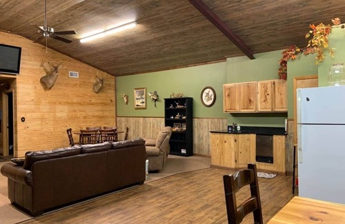 Grandview Acres guests are blessed with county atmosphere AND city convenience. Located 25 miles south of Stuttgart, just outside DeWitt city limits, the Bunkhouse was designed with hunters in mind. With 4 bedrooms and 3 full baths, 14 guests can enjoy a large living room, kitchenette, outdoor pavilion w/ fireplace, game cleaning station, kennels, boot room, covered shed, huge gravel parking area on 35 acres. Plenty of space to enjoy good company and relax before the next hunt. The outdoor enthusiast will enjoy the wildlife theme of the Bunkhouse. When you rent the entire bunkhouse you only share outside amenities with Grandview Acres Lodge guests. The owner’s home is right next door and she is available by cell phone. We do have 4 dog kennels you can reserve. Please let the owner know how many you will need. Pets are not allowed inside the Bunkhouse.