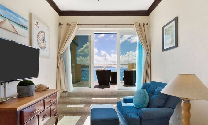 Part of a 7-bedroom villa, Grouper offers a master king bedroom with an en-suite bathroom and a 42” smart TV. Step up to the cozy indoor sitting area with views of the ocean and pool deck, or take it a step further—out onto your private balcony. Sip a cocktail, soak up the sun, or simply relax. The suite also features a fully equipped kitchen, dining space, and a comfortable living area. Brightly decorated with a touch of Caribbean charm, Grouper invites you to unwind in style.