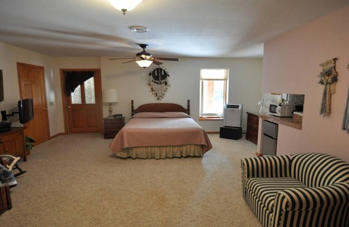 Easy to relax! There is an easy chair and a rocker, table and 2 chairs. It has a small coffee pot, small microwave and dorm size refrigerator and TV. You are also welcome to use our patios and gas grill. There is also a fire pit .