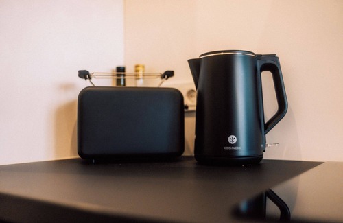 The kitchen is equipped with an oven, a stovetop, and a refrigerator, as well as a coffee maker, an electric kettle, and an ice maker. Bathroom amenities include a hair dryer, towels, and toilet paper. Other amenities include a BBQ grill, bed sheets, bike storage, and heating.