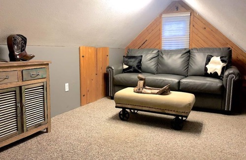 You are greeted by a front entry way that looks into the main living room featuring eclectic, western touches. Bedroom 1 has a new king size bed and Bedroom 2 has a new queen size bed. The newly renovated full bathroom features a step in shower. The living room and loft above have queen-size pull-out sofa sleepers for additional guests. There is a fully equipped kitchen featuring a cozy dining nook perfect for fueling up for a day of adventure. Through the kitchen is the half bathroom with a convenient laundry area. The beautiful backyard features a gas grill and outdoor seating to enjoy a meal.