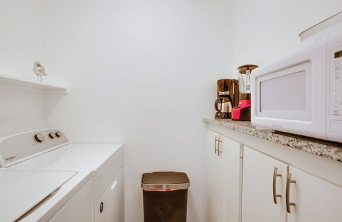 A laundry room is included with full size washer and dryer, ironing board, and iron.
