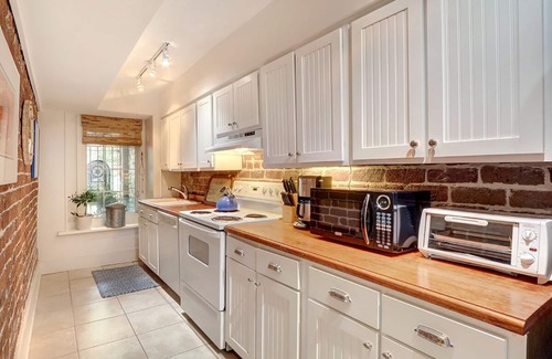 Jones Street Retreat is a vacation rental Savannah visitors will be happy to find. This one bedroom/one bathroom apartment reflects the spirit of the era with exposed brick walls in the interiors set off by wood flooring and antique décor. This elegantly decorated historic Savannah rental comes with a modern kitchen equipped with the supplies and equipment needed to whip up gourmet meals for yourself and your guests. It has a full-size oven and dishwasher, giving guests a sense of being in their own homes.