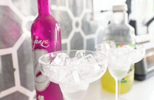 The poolside bar area has a blender, undercounter ice maker, and beverage fridge—because no pool day is complete without frozen drinks or kid-friendly mocktails.