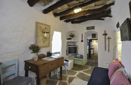 Built of traditional stone, the house stays cool all summer. It has two sleeping areas, which can accommodate a total of 5 persons: A large room contains a set of bunk beds and a single bed, while a smaller room contains a large double bed. There is also a living room with an open plan kitchenette and a bathroom with shower. The house is equipped with all the necessary kitchen and dishware (of traditional local pottery), cutlery, towels, bed and table linens, etc.