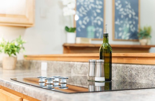 The kitchen is fully stocked with an oven, glass-top stove, microwave, full refrigerator, dishwasher, pots, pans, dishes, utensils, and cooking basics. Small appliances are also available such as a blender and toaster. Guests can help themselves to coffee from the Keurig or coffee pot. Make sure to check out the refrigerator, too, for some hidden treats! The dining table and 4 chairs are in the living room in an open-concept layout.