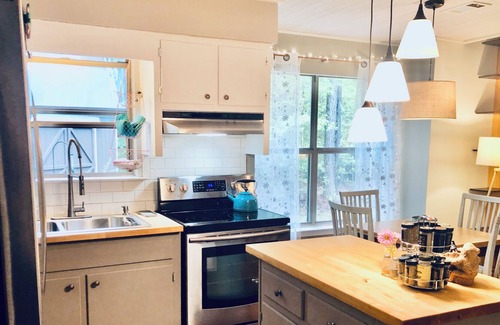 Charming & very private yet close to the conveniences of the city (Pooler & Downtown Savannah.) Also located near the new Hyundai Plant and just minutes from the world-class Roebling Road Raceway. This 1 & 1/2 story, saltbox cabin in the woods has recently been refreshed with new paint and new furnishings. It is 1,300 sq feet, with an additional 1,300 sq feet of outdoor living spaces (porches /decks), large fenced-in back yard plus outside bar area and hot tub. Although technically 3 bedrooms, the 2nd upstairs bedroom (w/ futon) could serve as an extended suite for the main upstairs bedroom. Clean and modern meets rustic and woodsy in this perfect Zen-like retreat home. It is quietly hidden away in the pine trees and yet an easy 11 miles from a multitude of stores and restaurants in the city of Pooler. Just 21 miles from Downtown Savannah and 35 miles from Tybee Island, a very quaint beach community. Perfect for an artist’s/writer’s getaway with creative ambience, unique art, and sizable library of books. With yoga props, quality stereo and open layout it is ideal for an intimate group retreat. Please note: we may be able to connect you with local yoga teachers and bodyworkers/therapists to complete your private wellness venture. Important to know: This is a NEW LISTING but we are not new to hosting. Check our glowing 5-Star Reviews at our other property on Tybee Island. Hermit Crab's Cottage https://www.vrbo.com/2466678?unitId=3035257