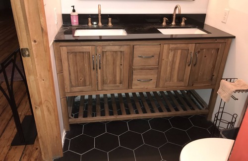Cedarburg loft with amazing refurbished flooring; massive wooden beams and huge sliding doors. Spacious and architecturally attractive. Furnished with king and twin bed, futon sofa, couch, kitchen, sheik bath.