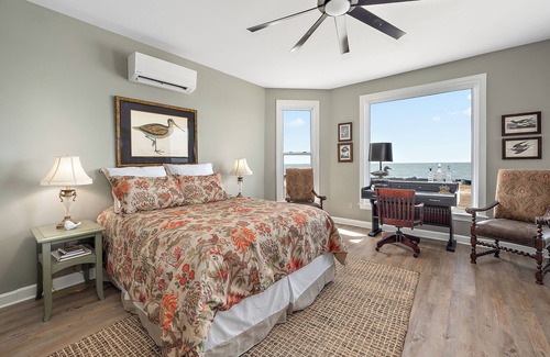 Upstairs, the master bedroom features a widow's walk for two, a queen size bed, and furniture to lounge on. There is a full bath across the hall. The second upstairs bedroom features two double beds. The house is spacious with lots of room to spread out.