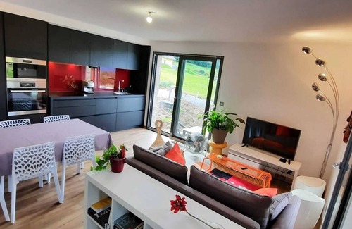 Inside, the accommodation offers a warm and spacious living room where you can unwind after a day of exploration. A fully equipped kitchen allows you to prepare your favorite dishes. A desk area is also available for professionals on the move. Additionally, central heating ensures optimal comfort in all rooms.