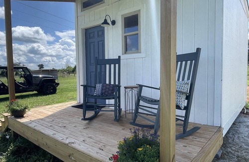 New cozy single room cabin style interior with wood plank walls featuring a bunk with a comfortable full and twin bed. Stand up shower in attached bathroom. Kitchenette for microwaveable meals, with a coffee maker and small fridge. Large porch with rockers to watch the sunrise and enjoy coffee looking over the hay fields and pastures of horses. We are a dark sky farm so you can easily view the stars on clear nights. Bring a flashlight for pulling in after sunset.