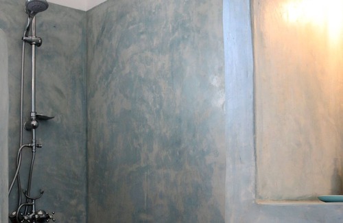 The house consists of 2 bedrooms.One with king size bed and the other with queen size.The one bedroom has an open plan connecting it directly to the living room and small kitchen.The living room has a double sofa bed,table, chairs and a television.The kitchen has a fridge,a single electric cooking ring,a coffee maker and kitchen utensils.The 2 bathrooms are with hydro massage showers.All the house has air condition.Outside there is a large seating area with tables,chairs,sun beds and a breathtaking view of Marathi Bay.