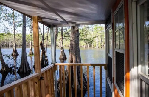The Houseboat has an outdoor seating area and a private back porch. The large property includes three tiny homes. There are several shared areas including a screened eating area, fire ring, boat launch, fish cleaning station and fishing pier. Kayak, paddle boat and pirogue rentals including life jackets and paddles available. Kayak rental - $35/day or $60/2 days. Tandem kayak, paddleboat or pirogue rental - $45/day or $70/2 days. There is no TV or WiFi.