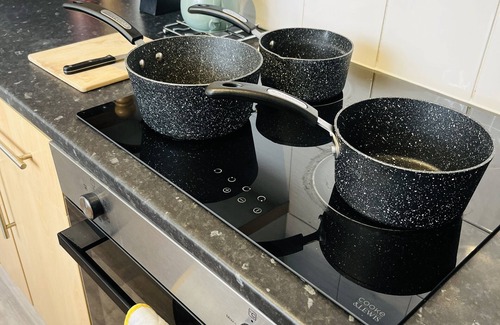 KITCHEN: Modern and fully equipped with everything you need during your stay. Includes, Electric hob, fan assisted oven & grill, microwave, fridge/freezer, washing machine. Also has a kettle, toaster, pots & pans, crockery, cutlery & utensils as well glasses & cups. Tea, coffee & sugar provided so you can make a brew and settle in.