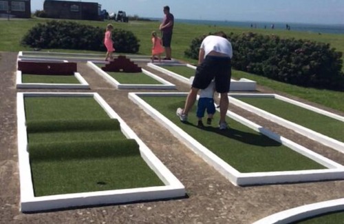 - **Site Amenities:** The coastal path passes through the site and the site features a barbecue area, a gym trail, a football pitch, a tennis net, crazy golf, a small golf course, and a fenced children's play area with a climbing frame and swings.