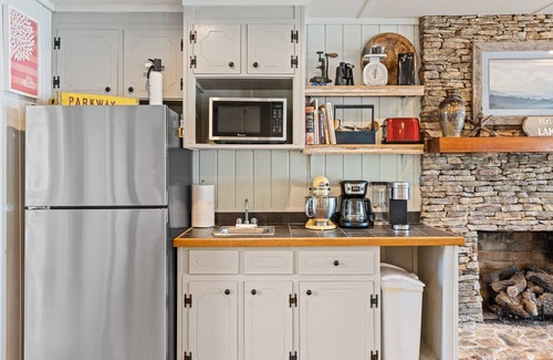 With unbelievable lake views in almost every room of the home, the cottage features a romantic master bedroom with a wood burning fireplace, a large lakeside porch to snuggle in a hammock with a book, and a relaxing two story dock dock ready for fishing or laying in the sun. Enjoy a cup of coffee in the adirondack chairs on the front porch and see the sun rising over the Hartwell dam across the lake. Roast marshmallows around our stone fire pit with vintage lighting and comfortable chairs as you enjoy the lake view.