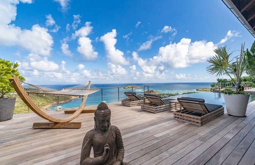 On the sumptuous wooden terrace the large heated infinity pool seems to blend into Saint-Barth's waters. Lounge chairs are set up to enjoy the breathtaking view, as well as a heated jacuzzi, comfortable outdoor seating areas and a day bed under the ajoupa. Huge jars make this exceptional environment even grander.