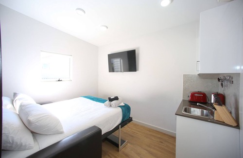 Enjoy a comfortable stay in our well-appointed studio featuring a queen bed, perfect for solo travelers or couples. This compact yet functional space is designed for convenience, offering all the essentials for a relaxing stay. With a thoughtfully arranged layout, this studio provides a cozy atmosphere that ensures a restful experience for both short and extended stays.