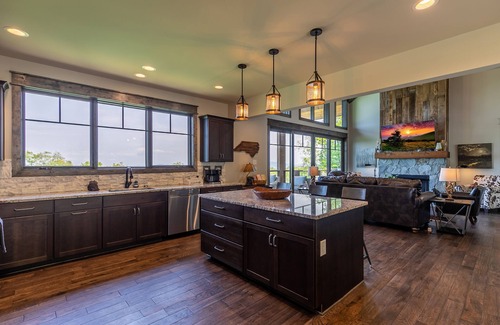 Inside, the open great room welcomes you with vaulted tongue-and-groove ceilings, expansive windows, and abundant natural light. Gather around the striking stacked-stone gas fireplace on the plush leather seating to watch a movie or the big game on the 70” smart TV. The kitchen is bright and beautifully equipped, featuring granite countertops, a spacious island with seating for three, and everything you need to prepare family meals or entertain friends. The dining table seats eight comfortably, ideal for gathering after a day of exploring Eagles Nest.