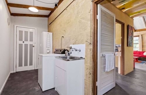 The kitchen is simple but functional, with everything you need to prepare meals during your stay. There’s a BBQ outside for grilling, and the full laundry and bathroom setup includes a tub that’s perfect for soaking tired feet after a walk or paddle.