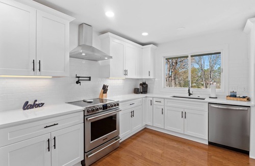 Lake views, fire pit area, corn hole, and charcoal grilling! Visiting May through October? Swim, fish, or take a leisurely paddle in the provided kayaks (2) or paddle board. Our home is located on a quiet cove, perfect for enjoying the lake. Please note that quiet hours outdoors are from 10:00 pm - 7:00 am (fire pit, back yard, etc.)
