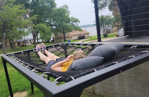 Step outside onto the patio to enjoy the Solo fire pit, Napoleon grill, custom star gazer hammock, and beautiful views of the lake across the street. As our guest, you'll have exclusive access to our gated neighborhood lake entrance only a short 4-minute walk away, complete with a boat ramp and dock where you can soak up the sun and enjoy panoramic views of the water.