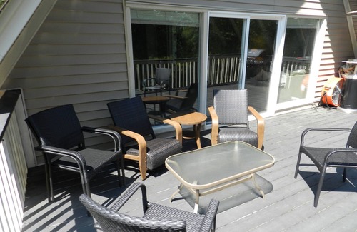 Our A Frame looks quaint and small as you turn down the paved driveway; spacious inside. Open views from decks and patio. COZY comfort invites family and friends to relax and enjoy!