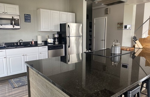 Our lake house is an open concept, modern design with natural light and nice finishes. The house is steps away from Georgetown Lake and has unobstructed lake views, a glass-enclosed porch with large charcoal barbecue, and nice outdoor furniture. A cozy reading loft located above the kitchen has a smart TV and futon. Master bedroom boasts a king bed, twin bunk bed, smart TV, lake view, private bathroom w/shower, and second bedroom has a queen bed and twin bunk. Second bathroom has a tub/shower. We even have a pack ‘n play and eating chair for the little ones! Modern kitchen with granite counters and stainless steel appliances, wood-burning fireplace, washer and dryer, a smart TV in the loft above the kitchen, and WiFi internet. Your stay includes all the comforts of home.