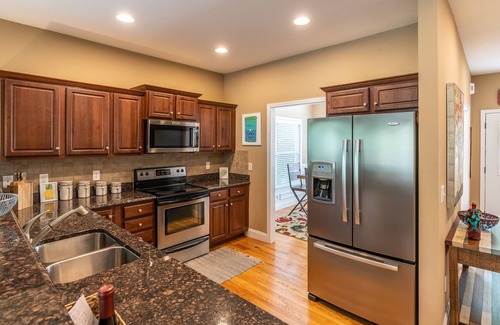 The fully equipped kitchen features granite countertops, stainless steel appliances, a spacious pantry, and everything you need to prepare and enjoy family meals.