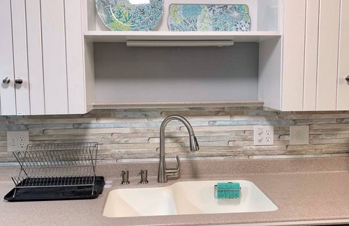 Well equipped kitchen, including Instant Pot, air fryer, blender, griddle, electric skillet, toaster oven, Keurig and coffee pot. Decent knives, wooden utensils and Hexclad non-stick pans. Plenty of dishes, utensils, baking pans, and cooking tools. Spices and basics like sugar, flour, salt, cooking oils and vinegars.