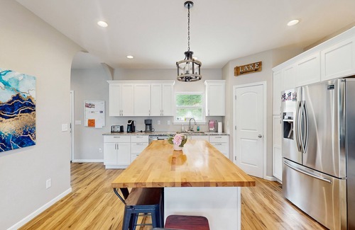 Inside, the home offers plenty of space for everyone to spread out. With two comfortable living areas—one upstairs and one downstairs—there's room for both relaxation and play. The downstairs area even features a foosball table for some friendly competition. The well-equipped kitchen includes an island with bar stools and flows seamlessly into the open living and dining area, making it the perfect spot for conversations over morning coffee or evening meals. Step outside onto one of two large decks with beautiful lake views.