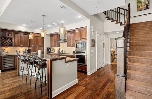 This 5-bedroom three-story townhome can accommodate up to 14 guests. The home is built into a sloping landscape, so the front entrance brings you into the second floor which serves as the main living level. This is a wonderful space for your friends and family to comfortably gather. On this level you will find a full kitchen, dining area, living room, balconies overlooking the lake, and a conveniently located half bathroom.