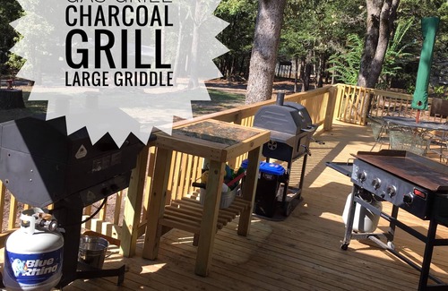 Across the back of the home is a very expansive deck! Lots of room to relax and view the lake or entertain and cook out with family and friends. There are 2 grills, a charcoal and a gas grill, a smoker, as well as a large gas griddle that makes a tasty stir fry or morning breakfast!