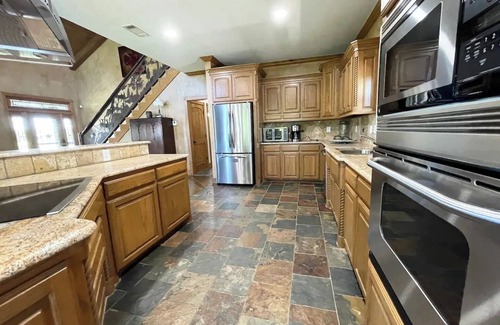 Welcome to our tranquil ranch retreat on 10 acres right on the water! Enjoy a spacious living area, loft, and luxurious master suite. Kids will adore the bunk bed room, which is spacious enough for adults as well. Relax outside in the hot tub or by the fire pit overlooking the lake. Bring your horses. Explore the beautiful surroundings and enjoy activities like horseshoes & cornhole. Sleeps 13 guests. Call regarding reunions, weddings, events and horse lodging. Our home is nestled in a quiet area on a scenic soil conservation lake with a unique stone house featuring 3 bedrooms, 2 full baths and a 1/2 guest bath, a loft, serene deck overlooking the lake. The backyard has lake access and a private dock. Our spacious home is ready for fun in the sun. Perfect year round: hot tub, fishing, horseshoes, corn hole, and inside games for the kids and adults to enjoy. The kitchen is equipped with the pots, pans, plates/bowls, glasses, cups, and cooking utensils you could need and a variety of spices.