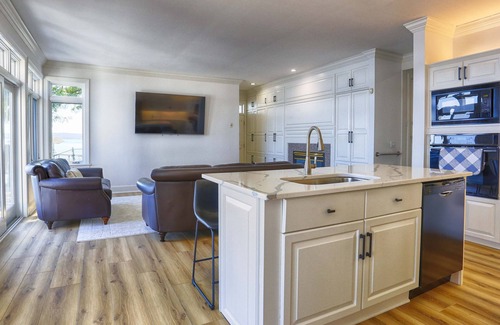 The kitchen, adorned with white, wooden cabinetry and expansive white granite countertops, is an oasis in itself. Find the cupboards stocked with everything you need for your culinary adventures, or hire a private chef to cook for the evening. Gather around the island bar area and pop a glass of Finger Lakes bubbly to toast your first evening in the house! The first of two living areas share this great room. A leather sofa and loveseat allow you to watch the game on the television, and soak up the award-winning Finger Lakes view.