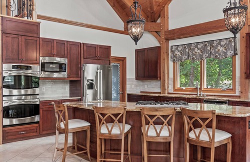 .....and then the best part, the outdoor entertaining is top of the line! Step outside and enjoy the heated pool (April 15th thru October 15th), hot tub, gas fire pit, cornhole boards and a outdoor kitchen area with SMART TV, ceiling heaters and retractable screens - and a ton of space to sit, relax, entertain and enjoy the amazing views! Ready to get out on the water? Head down to the private dock or take one of the kayaks or paddleboards that are provided with the property at no additional cost!