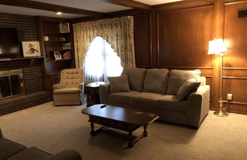 This is family oriented, private, beautiful brick home located three blocks from historic 3rd Street and 291 highway. Two bedrooms (king size bed, double bed, two twin beds) and two (full and 3/4) bathrooms are on the main floor. Patio room has a futon sofa. The additional floor includes two bedrooms (double and twin bed) and a full bathroom (when included) but is an EXTRA booking..