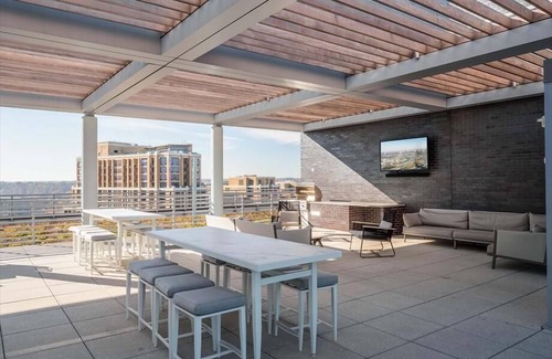 Soak up the rays at the outdoor pool, which is surrounded by a sprawling sun deck, BBQ grills, fire pits, lush landscaping, and panoramic views. Savor the city views any day of the year (rain or shine!) from the exclusive rooftop lounge, where you’ll find comfy seating options that are great for work or play.