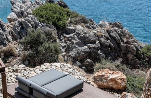 Villa Europa was conceived with a holistic approach; addressing both the mind and the body with comfort, luxury and majestic natural beauty. The villa is situated amidst the wild cliffs of Cape Koutoula in Western Crete, offering spectacular sea views, rugged landscapes, and the ultimate in privacy. This exclusive property is a small paradise for those seeking primordial contact with nature combined with romance and a sense of freedom without sacrificing comfort and luxury. The home accommodates eight guests in four spacious double bedrooms with ensuite bathrooms. The bohemian chic décor is highlighted with stone walls, cement floors and wooden ceilings. And with glass sliding doors, the transition to outside is virtually seamless.Rentals at Villa Europa are Tuesday to Tuesday.INTERIOR: The 240 sqm villa has four master bedrooms with ensuite shower rooms overlooking the sea. All are furnished with warm, natural materials, modern furniture and eclectic decorations. The open-plan living area offers sliding glass doors, comfortable furniture, a dining table seating up to eight guests, a fully-equipped kitchen, and a guest WC. The atrium features an inviting outdoor fireplace and cozy swinging chairs. EXTERIOR: A specially designed swimming pool blends harmoniously with the surrounding natural setting. The wrap-around sundeck has plenty of lounge chairs for sunbathing and reading. There is a covered dining table for al fresco dining and comfortable sofas for enjoying good conversation with an aperitif in hand.