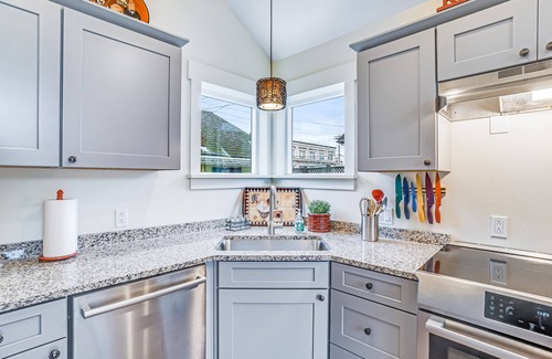With lofty ceilings and large picture windows that let in an abundance of natural light, this bright and comfortable home in downtown Anacortes will place you right in the midst of Washington's coastal beauty. Follow the ramp leading up to the front door for easy, step-free access, and make yourself at home in the open, air-conditioned great room with a plush sectional sofa, a window-side dining space, and a polished kitchen with stylish cabinetry and stainless steel appliances that include an induction range. Take your dogs for a walk around town or to Cap Sante Park, come home to toss the day's clothes in the private washer/dryer, and light the gas grill in the fully fenced yard in preparation for a homemade dinner. As for your evenings, relax while streaming your favorite shows or movies on the wall-mounted flatscreen TV in the living area.