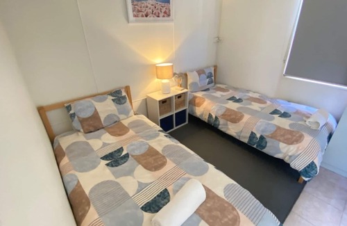 The best feature of this family cabin is the location - 15ms from the playground, the pool, tennis courts and BBQ area, but completely private from other park guests. With a full size queen bed in one room, and 2 single beds in the second room - sleeps 4 people comfortably.