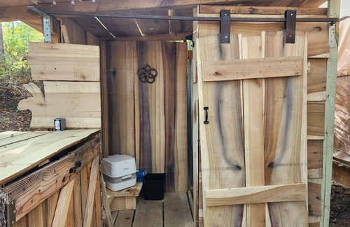 It has a large bar area outside with a sink that has hot and cold running water, a bathroom, and shower with hot and cold water. While you are here, you can enjoy nature and you can also venture onto the farm where we have llamas, goats, mini donkeys, and other animals!