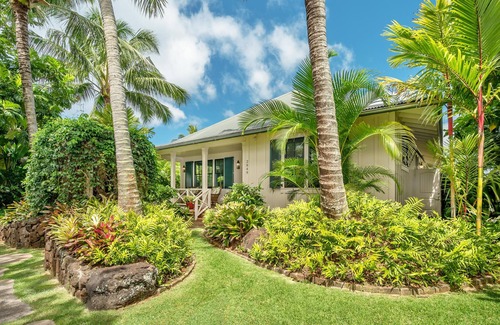 This open-air two-bedroom cottage on Kauai features a plantation-style cottage with two bedroom suites. Each bedroom has a king bed, private en suite bathroom with clawfoot tub, an indoor shower and a private outdoor lava rock shower. The open floor plan places the kitchen at the heart of the home with comfortable indoor and outdoor living spaces and dining areas. Design touches like polished wood flooring and tropical wall art add to the tropical vibe of this island retreat.