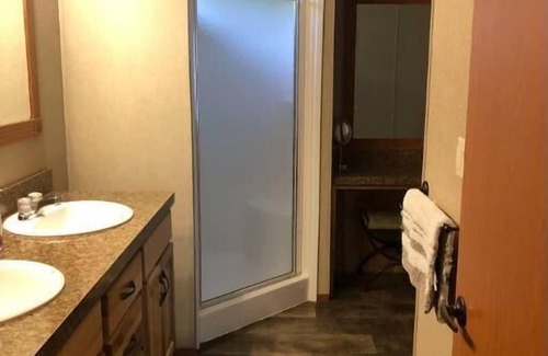 The Lodge sleeps up to 10! This 2017 double wide mobile home has 4-bedrooms, 2 full baths and is completely furnished. WiFi and a smart screen TV with cable are provided. The kitchen is fully stocked and has most of your everyday small appliances and then some. A HE washer and dryer are also provided for your convenience. There is also a large back deck that is perfect for outdoor gathering with a gas grill and fire pit out back of home.