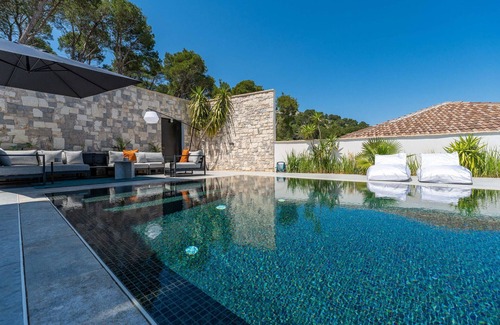Travel to the Croatian island of Pasman and enter this beautiful and luxurious vacation home in Tkon. Enjoy your vacation here together, but still experience your privacy. The house offers you three fully equipped living areas on two levels, so you can travel together with friendly families and couples and also retreat to your comfortable and private living area. Take advantage of the fully equipped kitchen, squeeze yourself a juice in the morning, make yourself an espresso and prepare scrambled eggs. On cooler days, enjoy a puzzle together or play board games by the fireplace in this high-quality home that will win you over with its design, decor and furnishings.